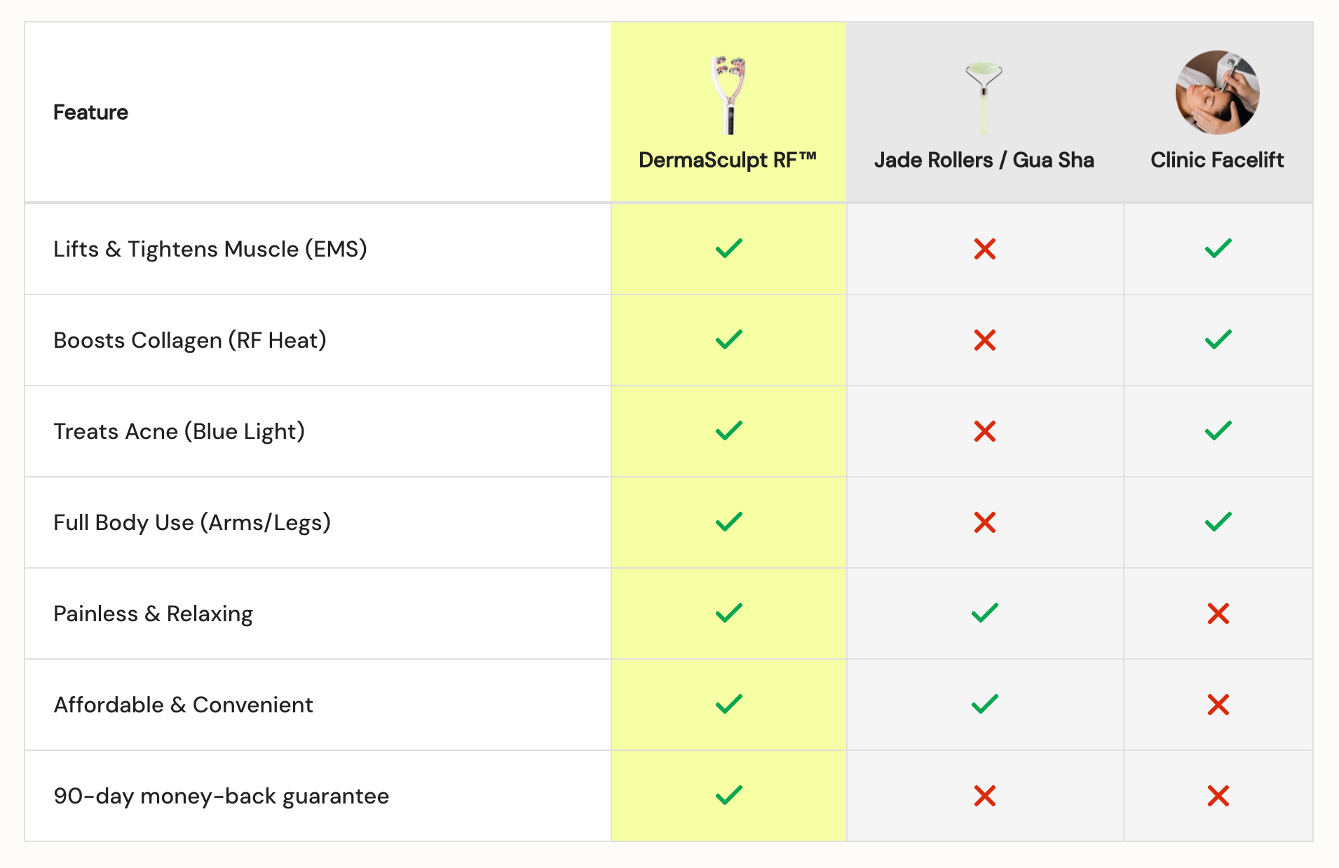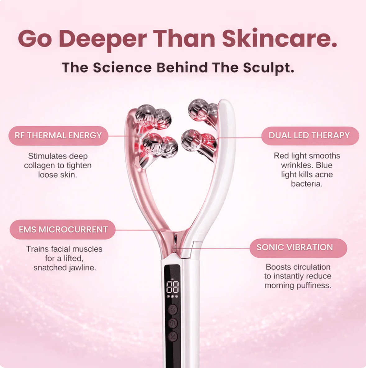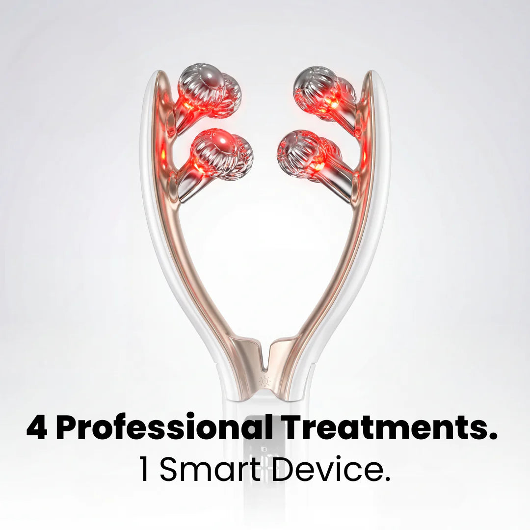 Stop relying on creams that only sit on the surface. The DermaSculpt™ combines 4 clinically proven technologies: Radio Frequency, EMS, LED Light, and Sonic Vibration.